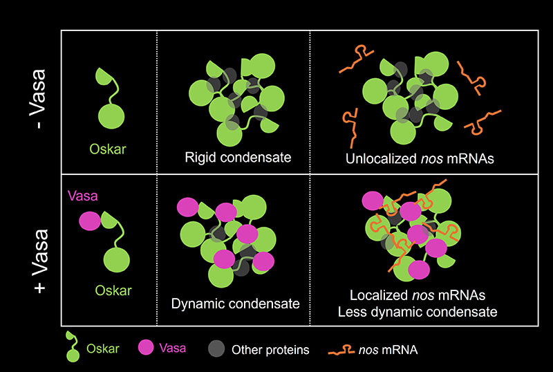 “In this study, we investigated the role of the conserved DEAD-box RNA helicase Vasa in germ granule formation in Drosophila. We demonstrate that condensation of Oskar (Osk), the germ granule nucleator, occurs independently of Vasa. However, in the absence of Vasa, Osk condensates become aggregated and exhibit minimal fluorescence recovery after photobleaching, indicating reduced dynamics. Consistently, Vasa expression enhances Osk condensate recovery and decreases Osk partitioning into condensates. Furthermore, Vasa and Osk together are necessary and sufficient to recruit germ granule mRNAs to condensates. Notably, localization of the germ granule nanos mRNP limits Vasa-dependent enhancement of Osk exchange with the surrounding cytoplasm. Together, our findings establish Vasa as a central regulator of condensate dynamics and mRNA localization in vivo.”